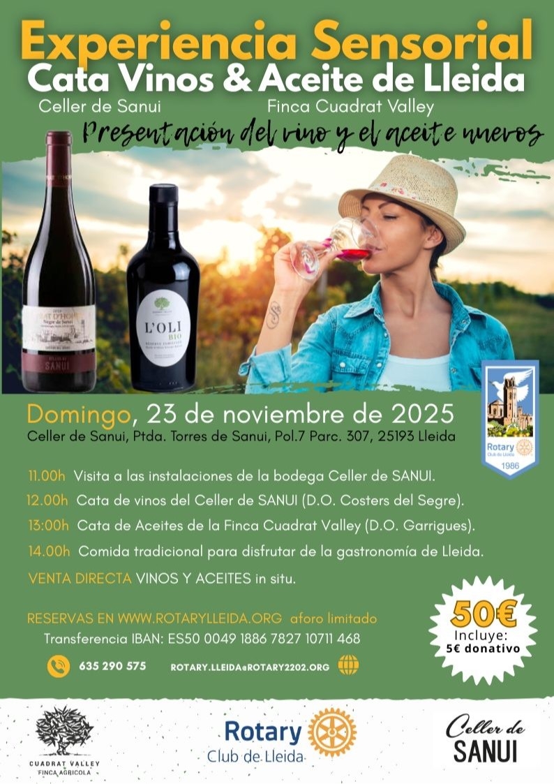 El Rotary Club de Lleida t'invita a una experiència sensorial única: visita al Celler de SANUI, cata dels seus vins (D.O. Costers del Segre) i cata d'olis de la Finca Cuadrat Valley (D.O. Garrigues). Aprèn, prova, degusta i emporta't producte directament del productor. Ideal per a amants de l'enogastronomia i per regalar (o regalar-te) un diumenge inoblidable.